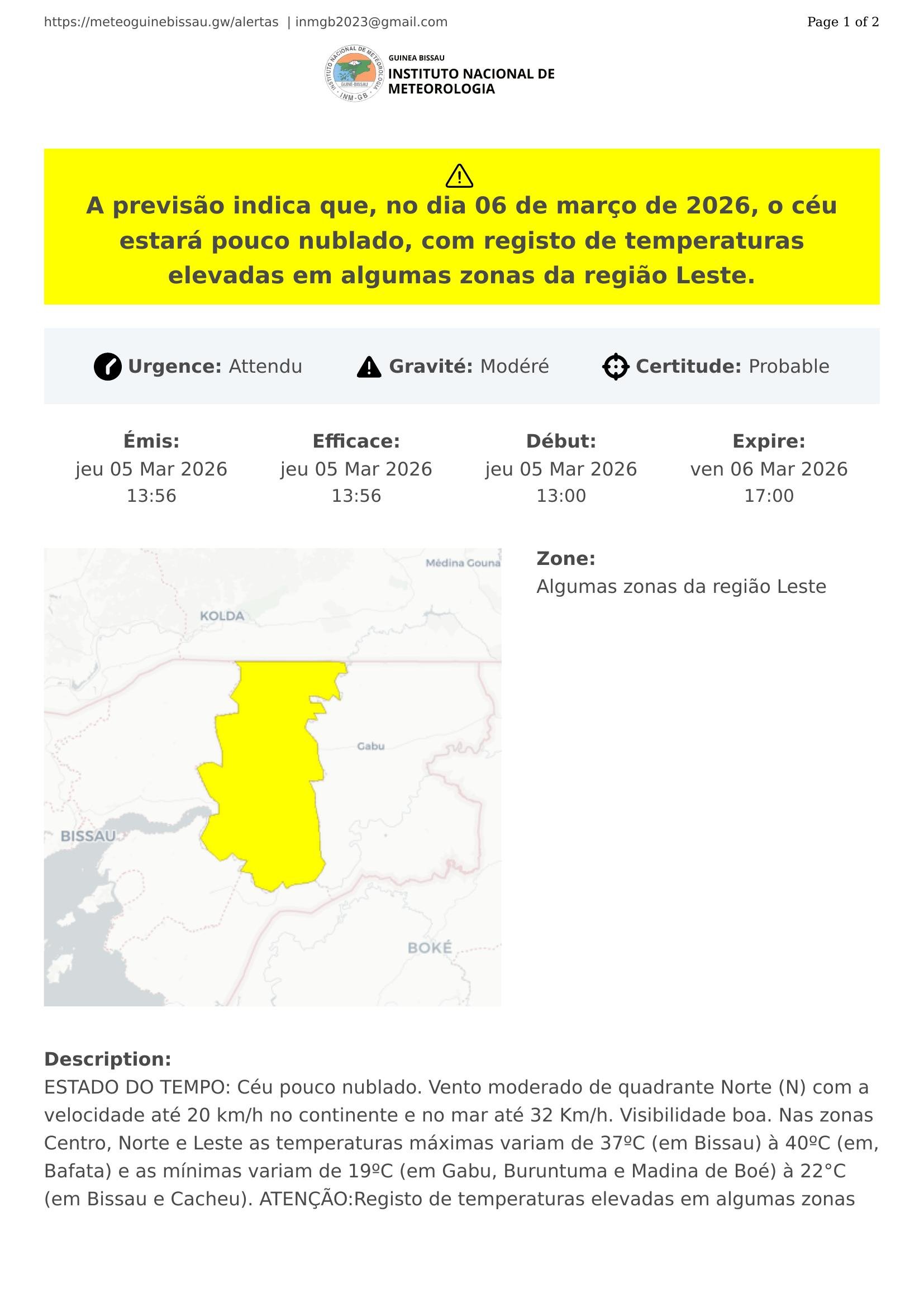 A previsão indica que, no dia 06 de março de 2026, o céu estará pouco nublado, com registo de temperaturas elevadas em algumas zonas da região Leste.
