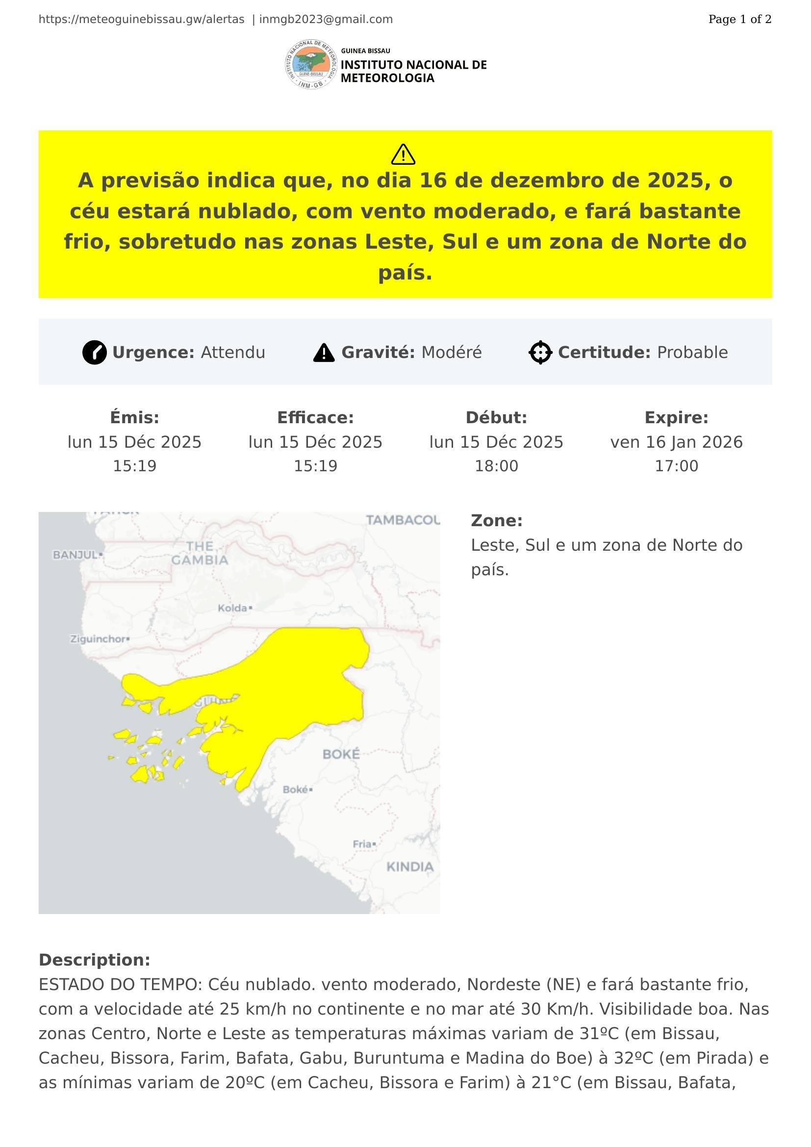 ESTADO DO TEMPO: Céu nublado. vento moderado, Nordeste (NE) e fará bastante frio, com a velocidade até 25 km/h no continente e no mar até 30 Km/h. Visibilidade boa. Nas zonas Centro, Norte e Leste as temperaturas máximas variam de 31ºC (em Bissau, Cacheu, Bissora, Farim, Bafata, Gabu, Buruntuma e Madina do Boe) à 32ºC (em Pirada) e as mínimas variam de 20ºC (em Cacheu, Bissora e Farim) à 21°C (em Bissau, Bafata, Gabu, Buruntuma e Madina do Boe). No Sul e Ilhas as temperaturas máximas variam de 28ºC (em Bubaque) à 31ºC (em Buba e Cacine) e as mínimas variam de 21ºC (em Buba) à 23ºC (em Bubaque).
