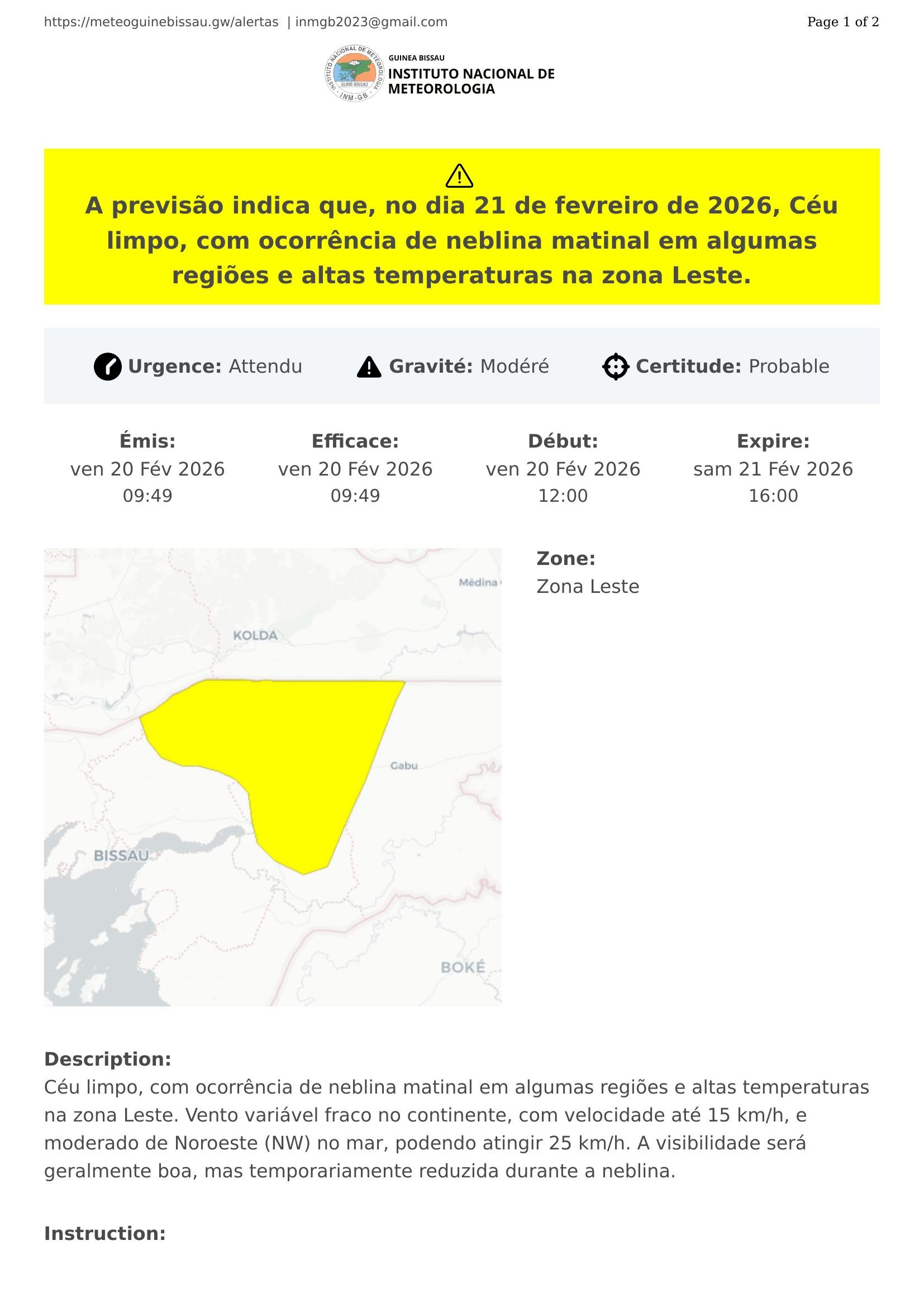 A previsão indica que, no dia 21 de fevreiro de 2026, Céu limpo, com ocorrência de neblina matinal em algumas regiões e altas temperaturas na zona Leste.