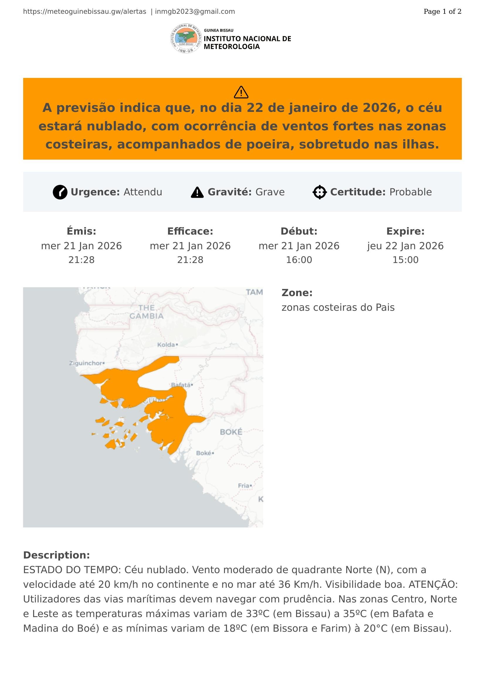 A previsão indica que, no dia 22 de janeiro de 2026, o céu estará nublado, com ocorrência de ventos fortes nas zonas costeiras, acompanhados de poeira, sobretud