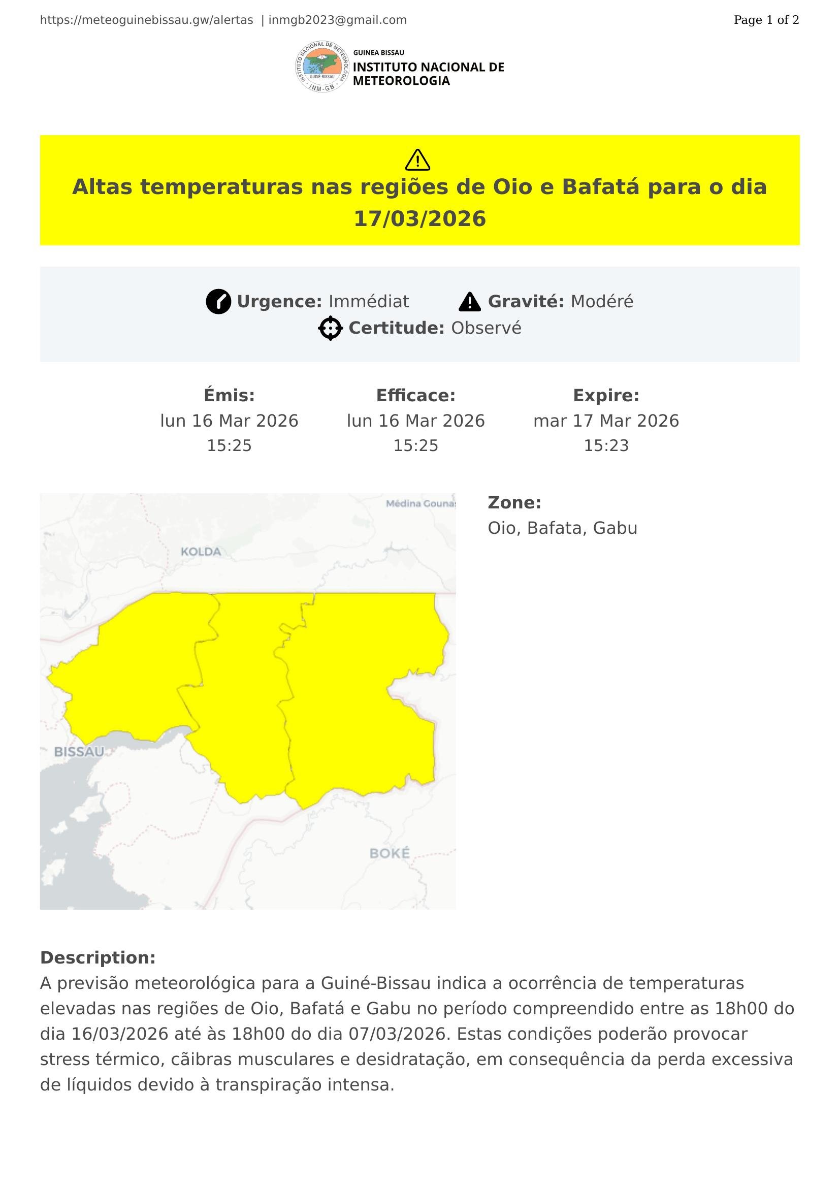 A previsão meteorológica para a Guiné-Bissau indica a ocorrência de temperaturas elevadas nas regiões de Oio, Bafatá e Gabu no período compreendido entre as 18h00 do dia 16/03/2026 até às 18h00 do dia 07/03/2026. Estas condições poderão provocar stress térmico, cãibras musculares e desidratação, em consequência da perda excessiva de líquidos devido à transpiração intensa.