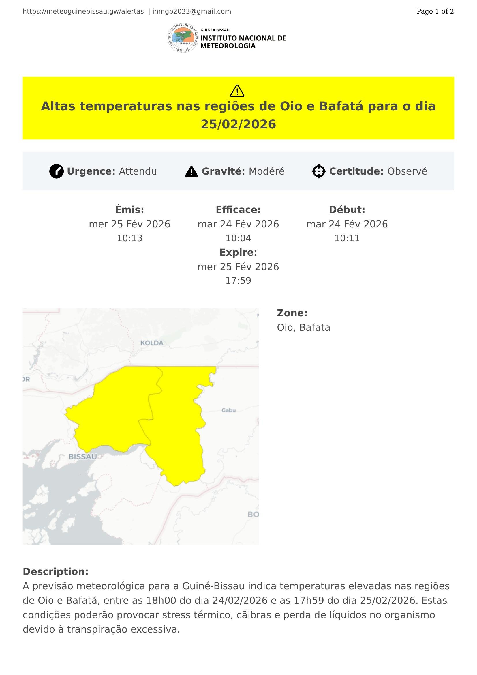 A previsão meteorológica para a Guiné-Bissau indica temperaturas elevadas nas regiões de Oio e Bafatá, entre as 18h00 do dia 24/02/2026 e as 17h59 do dia 25/02/2026. Estas condições poderão provocar stress térmico, cãibras e perda de líquidos no organismo devido à transpiração excessiva.