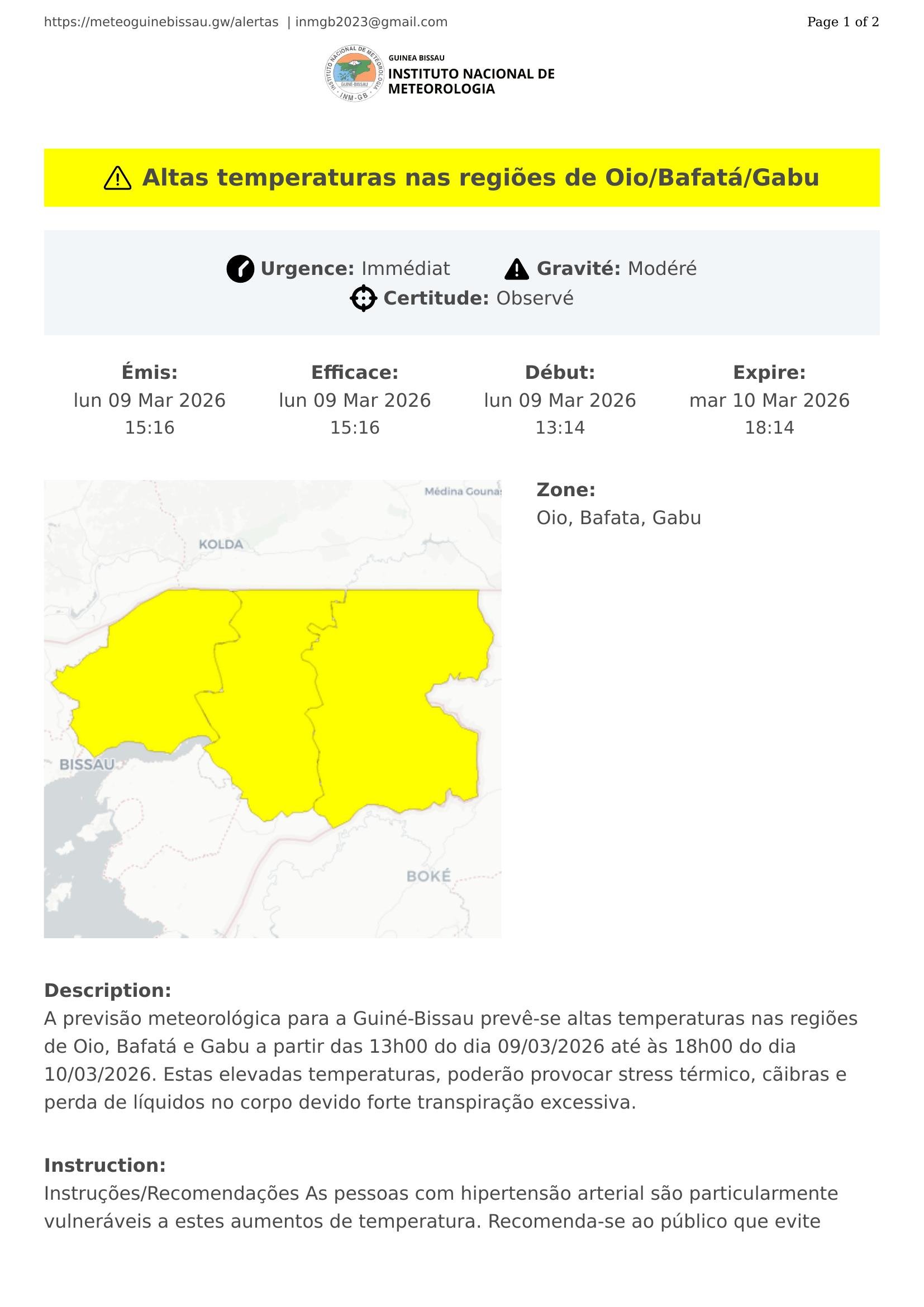 A previsão meteorológica para a Guiné-Bissau prevê-se altas temperaturas nas regiões de Oio, Bafatá e Gabu a partir das 13h00 do dia 09/03/2026 até às 18h00 do dia 10/03/2026. Estas elevadas temperaturas, poderão provocar stress térmico, cãibras e perda de líquidos no corpo devido forte transpiração excessiva.
