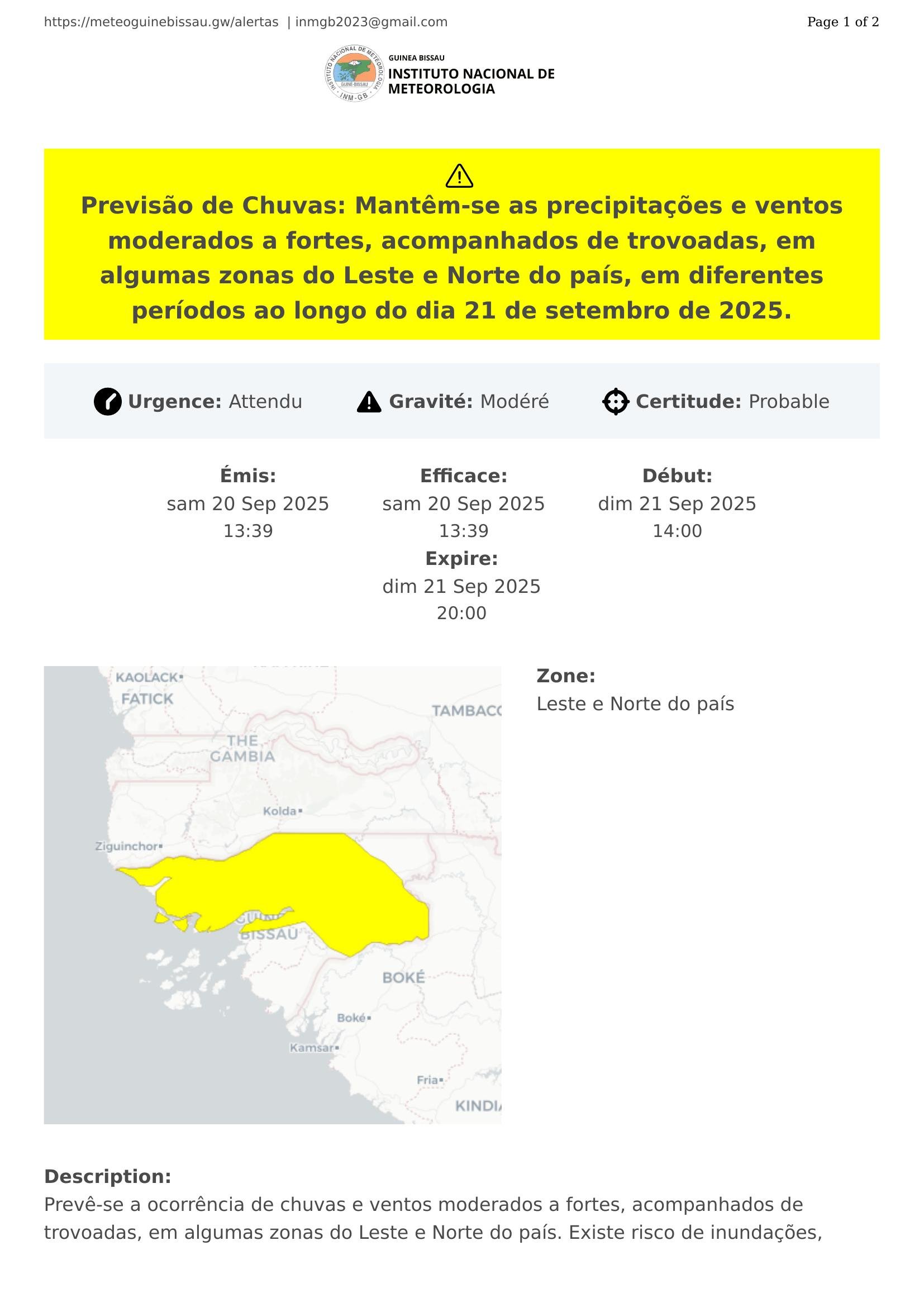 Prevê-se a ocorrência de chuvas e ventos moderados a fortes, acompanhados de trovoadas, em algumas zonas do Leste e Norte do país. Existe risco de inundações, sobretudo nas áreas húmidas e nas zonas costeiras vulneráveis. As chuvas e ventos mais intensas são esperadas entre a tarde e noite de domingo (21/09).