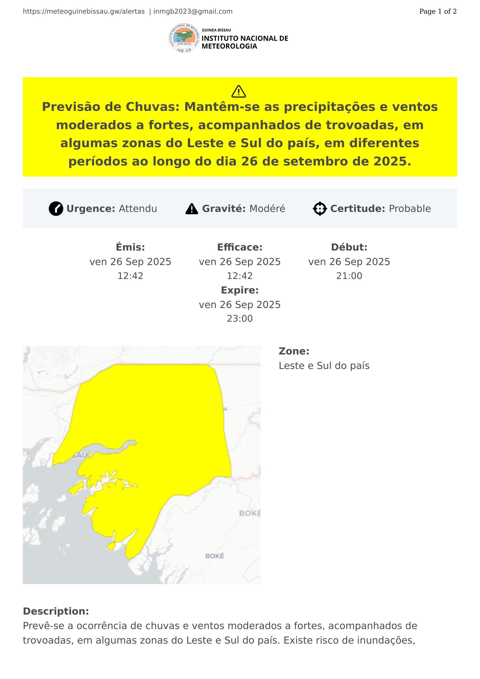 Prevê-se a ocorrência de chuvas e ventos moderados a fortes, acompanhados de trovoadas, em algumas zonas do Leste e Sul do país. Existe risco de inundações, sobretudo nas áreas húmidas e nas zonas costeiras vulneráveis. As chuvas e ventos mais intensas são esperadas entre a noite de sexta-feira (26/09).